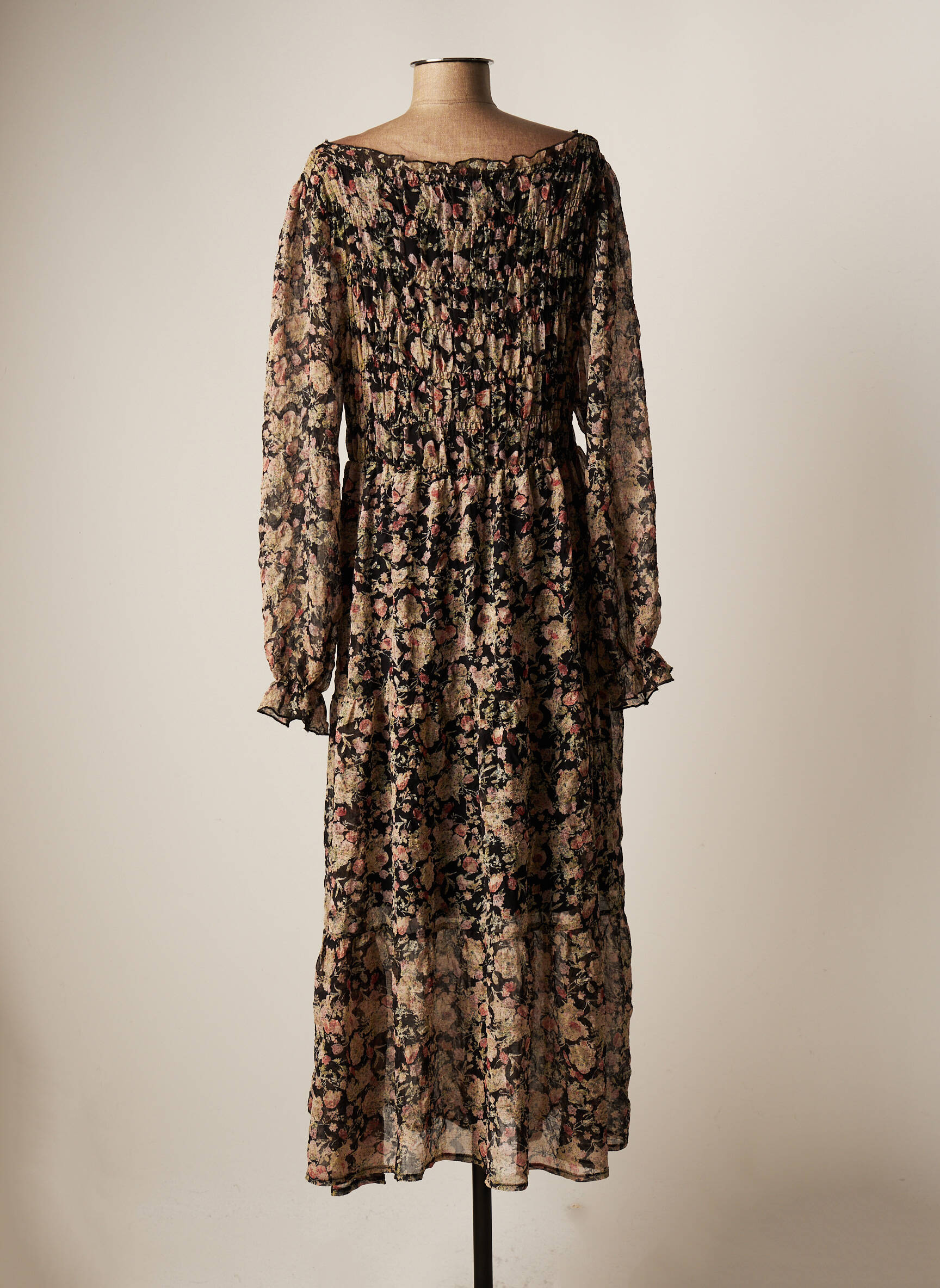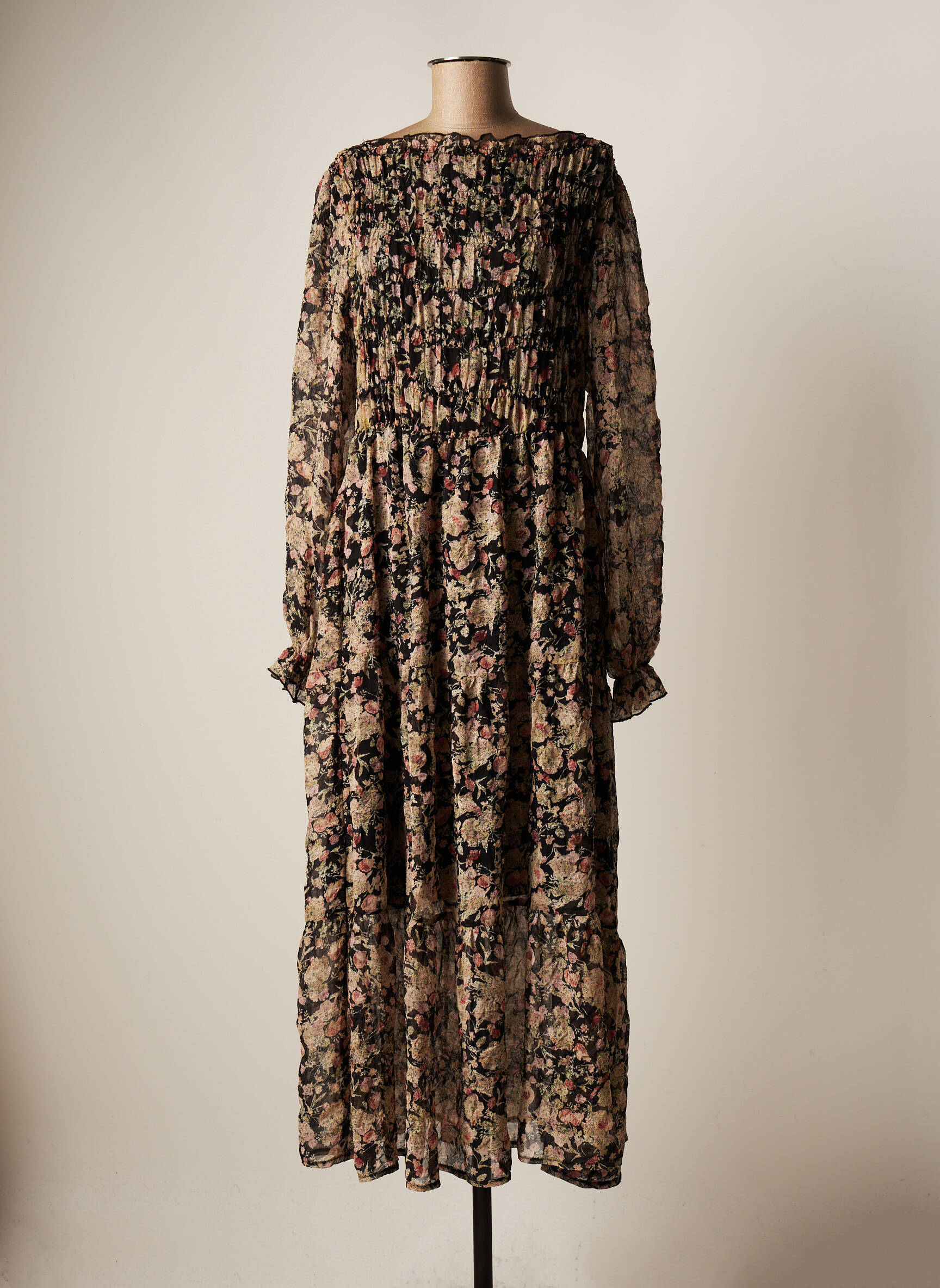 Rochie Lungă Cream Negru Mâneci Lungi